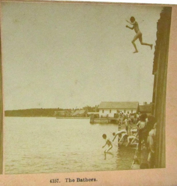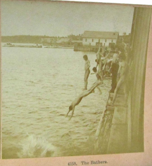 This pair of pictures from the Watertown (Wisconsin) Historical Society documents a circumstance in 1895 that appears to be an example of that accommodation between the boys and the town. The Rock River had been dammed to form a lake that was suitable for aquatic activities and the boys were permitted to use the lake dock as a base. In the first photo some figures (probably boys) are visible on the dock above the dam. Examining the close-up second image suggests that the wooden wall behind the boys on the dock might have served as a screen where they could disrobe before taking the plunge.
