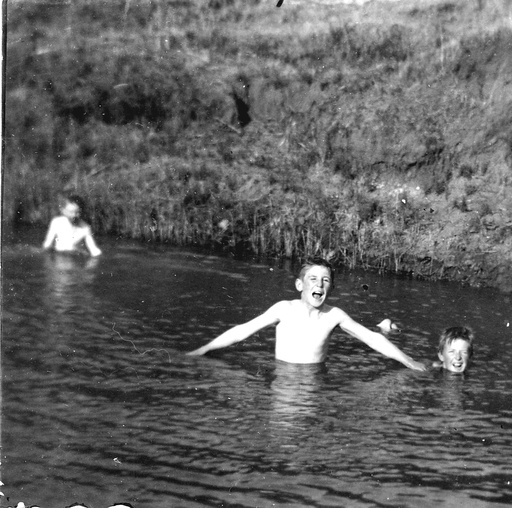 Any lingering doubts about camp swimming practices are dispelled by the two boys in the foreground of this image.