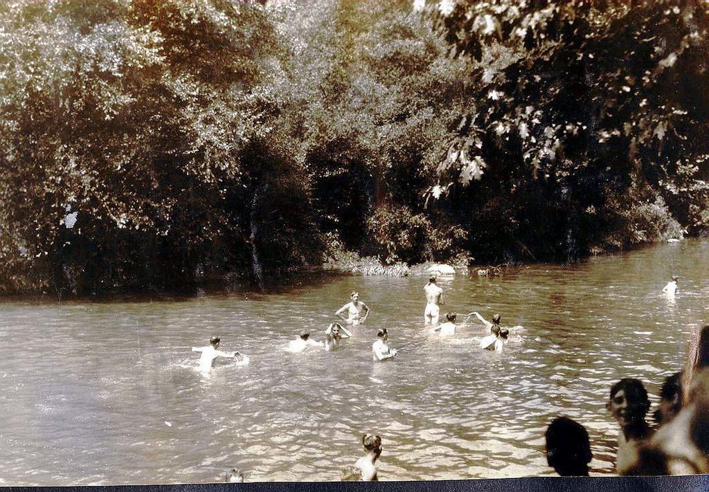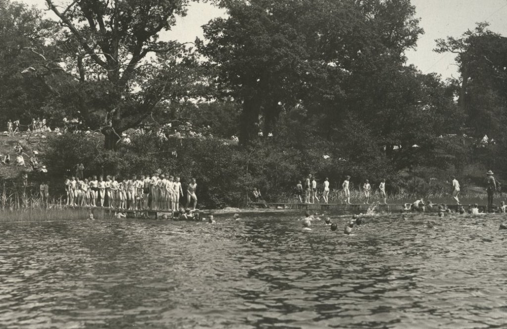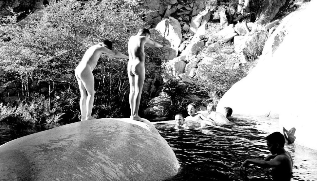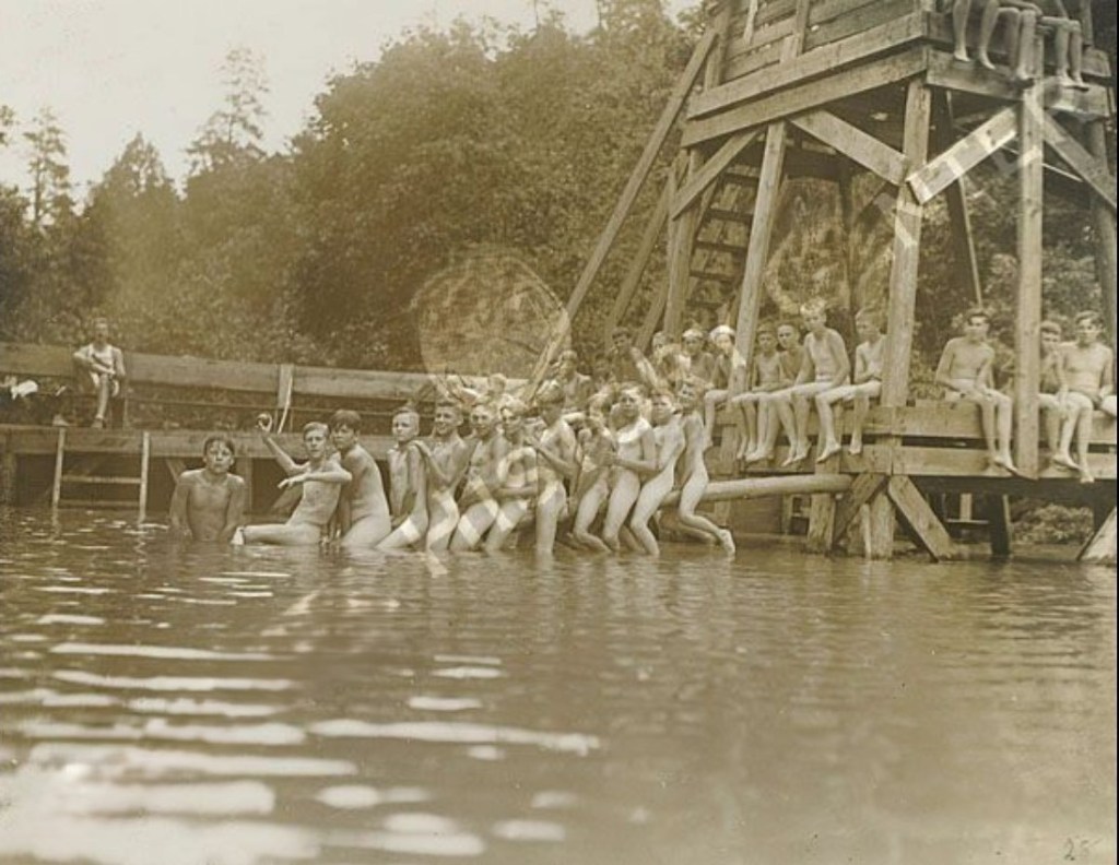 The caption states that this camp scene is from 1930. The supervisors in this image are suited, but their charges appear to be clothing optional – with most opting out.