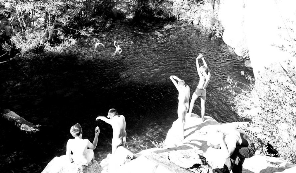 This appears to be another boys’ camp scene. The only clothed person is the guy in the robe on the (life guard?) tower.