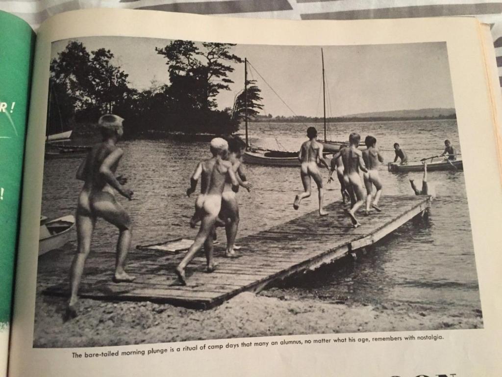 This picture seemed like a good capstone to our camp swimming presentation. It appeared in the June 1950 issue of Holiday magazine. Note the text below the picture extolling the joys of the “bare-tailed morning plunge.” Judging from the trees in the background, there was a pretty stiff breeze on that morning. Stout lads, all.