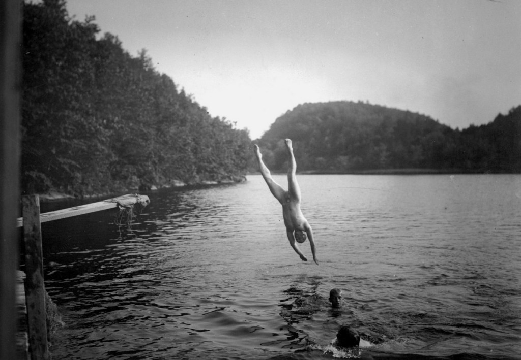 This perfectly framed dive was executed at a YMCA camp “near NYC” sometime between 1910 and 1920. My nomination for the mystery location is Westchester County NY. It is a sprawling area that borders directly on NYC and lies along the east bank of the Hudson River. In this time period there were probably many unspoiled locations that might have been home to this camp.