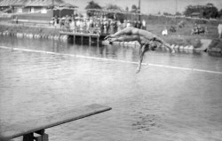 And here’s one that looks like it’s from ‘way back. Among other dated elements, this doesn’t look like a modern springboard. What’s that white line in the water?