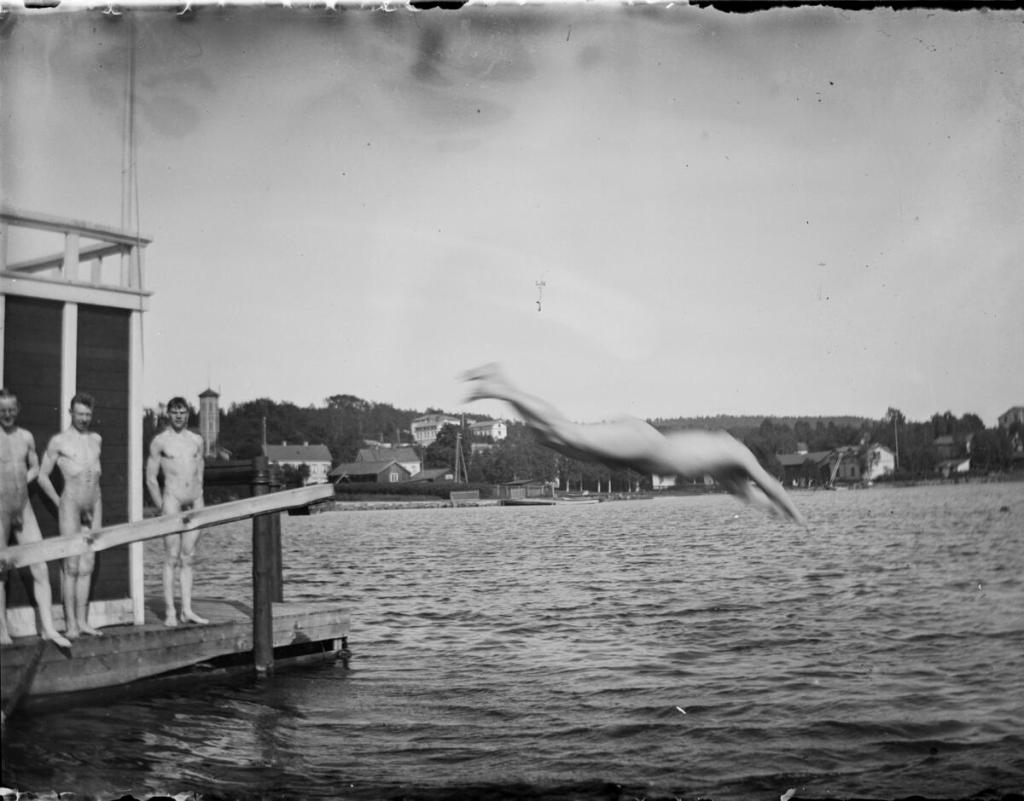 This is image was obtained from something called the Digitaltmuseum organization. They collect and archive images from various Swedish museums. The description was simply “four men in an open-air bathhouse.” No date, location or further description. Nice pic, though.