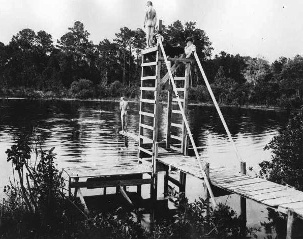 These two unclad lads seem to be contemplating a plunge from a homemade diving tower. We’ve seen these types of purpose-built outdoor structures before in various images posted on this website. The thought that always crosses my mind when viewing such an installation in a natural body of water is: “How do they know the water is deep enough?”