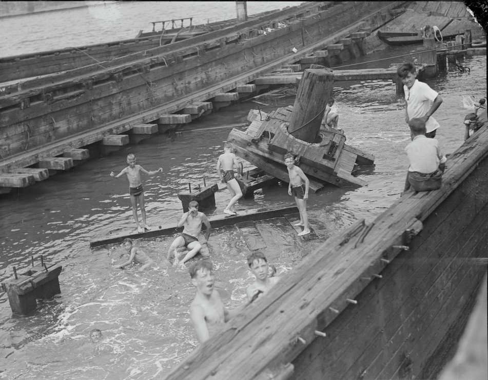 These guys are bathing in a water filled hulk of an old sailing ship in Chelsea Creek north of Boston. We’re now in 1938. Despite its name, the “creek” was a navigable waterway that had active piers back in the day.