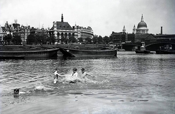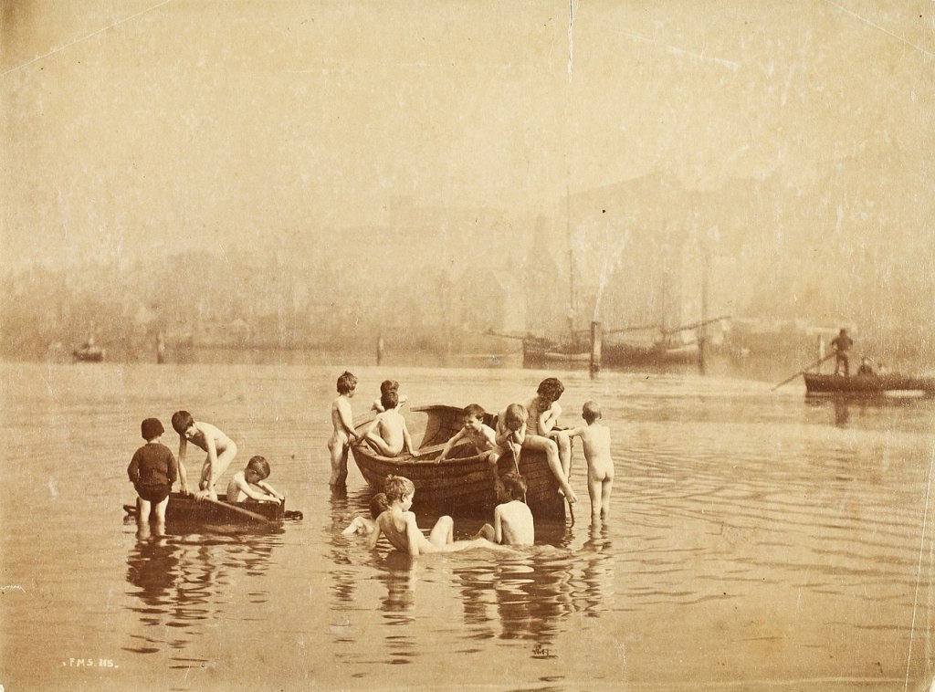 These two images document the regular use of this fabled river that flows through the heart of London in the same spot a “couple of hundred yards from the Blackfriars Bridge” over multiple decades. Apparently, it was a very public location in which the boys would be visible to passersby.