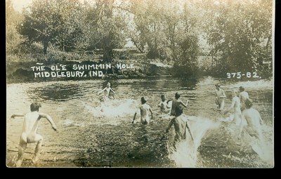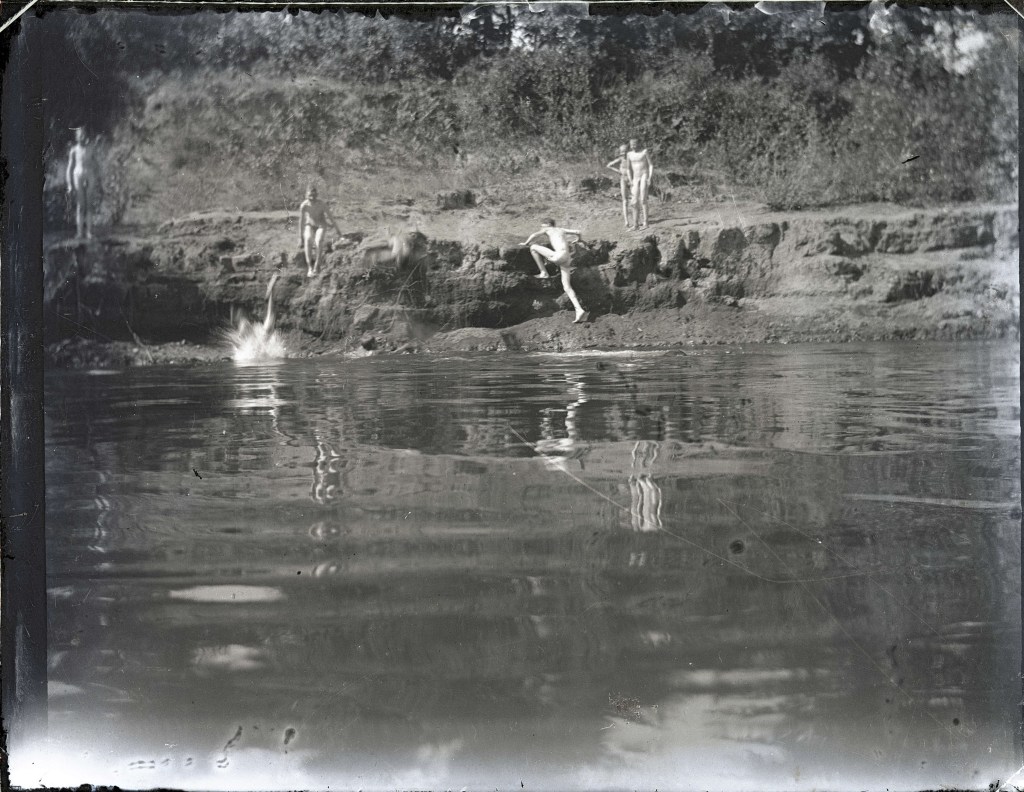There’s no denying the youthful energy captured in this frame as this group of nude boys dashes into the “hole.” Although undated, the location “Middlebury, IND” is pretty specific. It is the name of a town on the northern border of Indiana. The body of water pictured is probably the Little Elkhart River.
