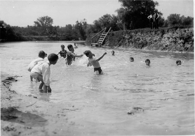 This undated image comes from the Wayne State University (Detroit, Michigan) archives. The difference in choice of swimming costume is inconsequential to these boys. The sketchiness of their diving platform is also of no apparent concern. In this heavily industrialized setting, one can’t be too choosy.