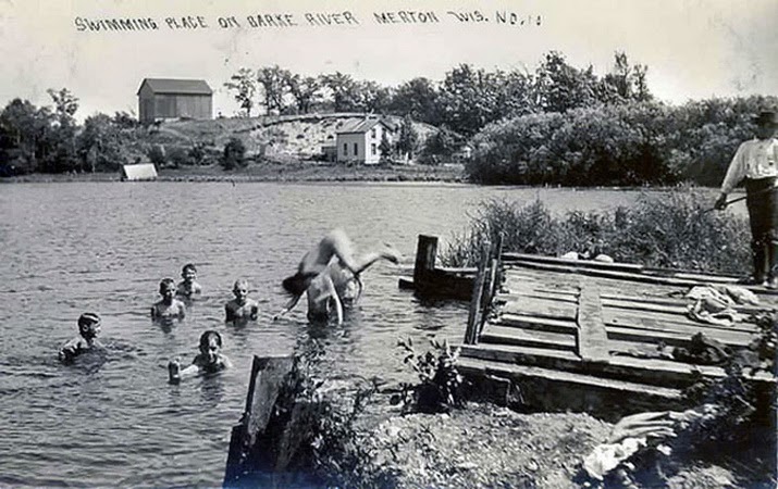 The inscription misspells “Bark River” which these days is a scenic boating destination. Merton, Wisconsin is the site of a dam, so this may be a manmade lake. The role of the adult in the frame is unclear. He’s holding some sort of pole, so maybe he’s the lifeguard.