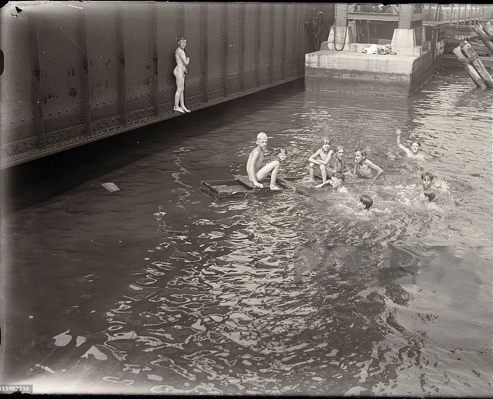 Skinny dipping was not always pursued in rural and other unspoiled locations. Industrialized locations were fair game as well for boys trying to beat the heat and have a little fun. The rivers that flowed through cities were arteries of commerce with all the attendant hazards that could entail. Sometimes that meant swimming among industrial wreckage. These next few images capture those sorts of scenes.