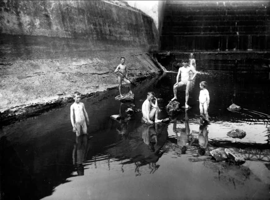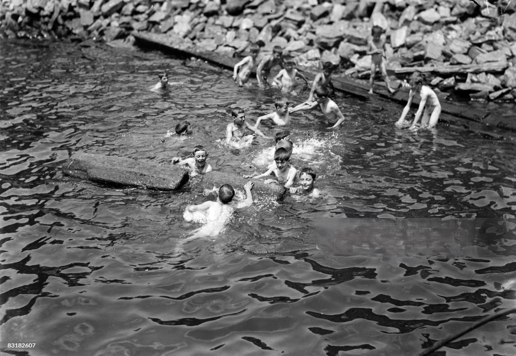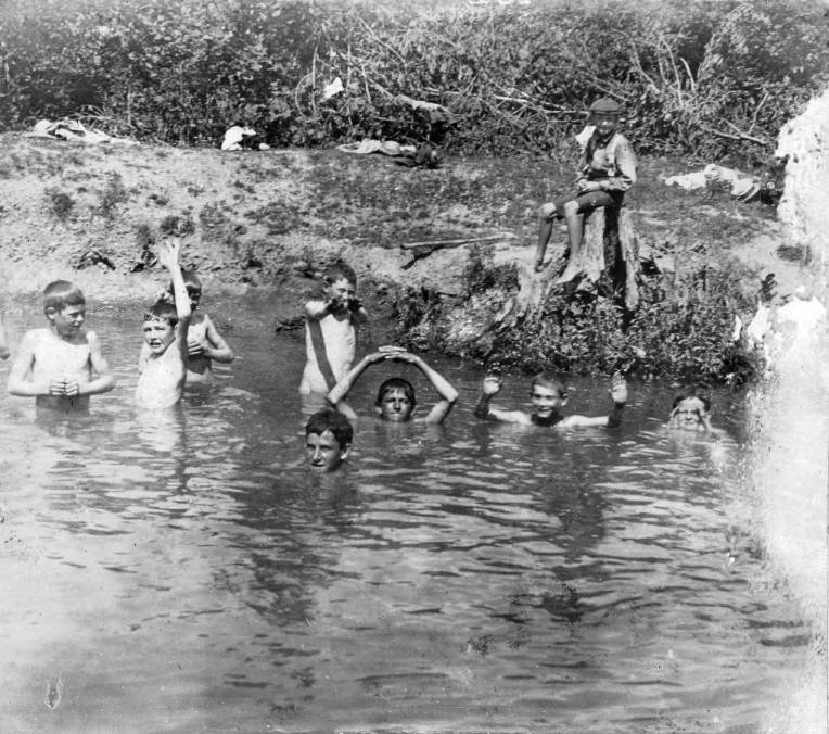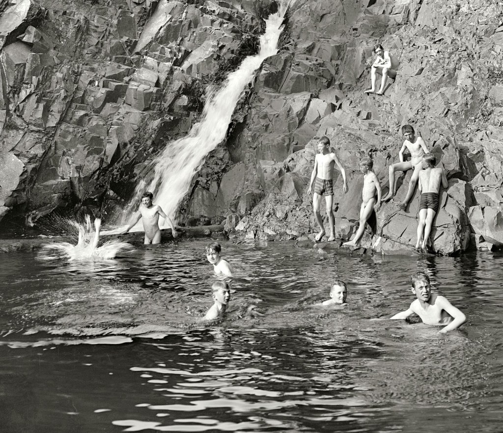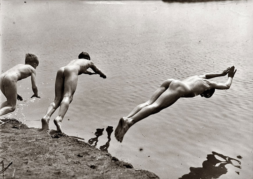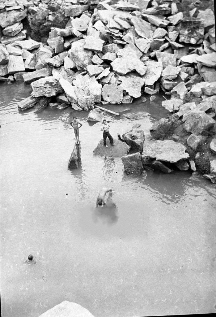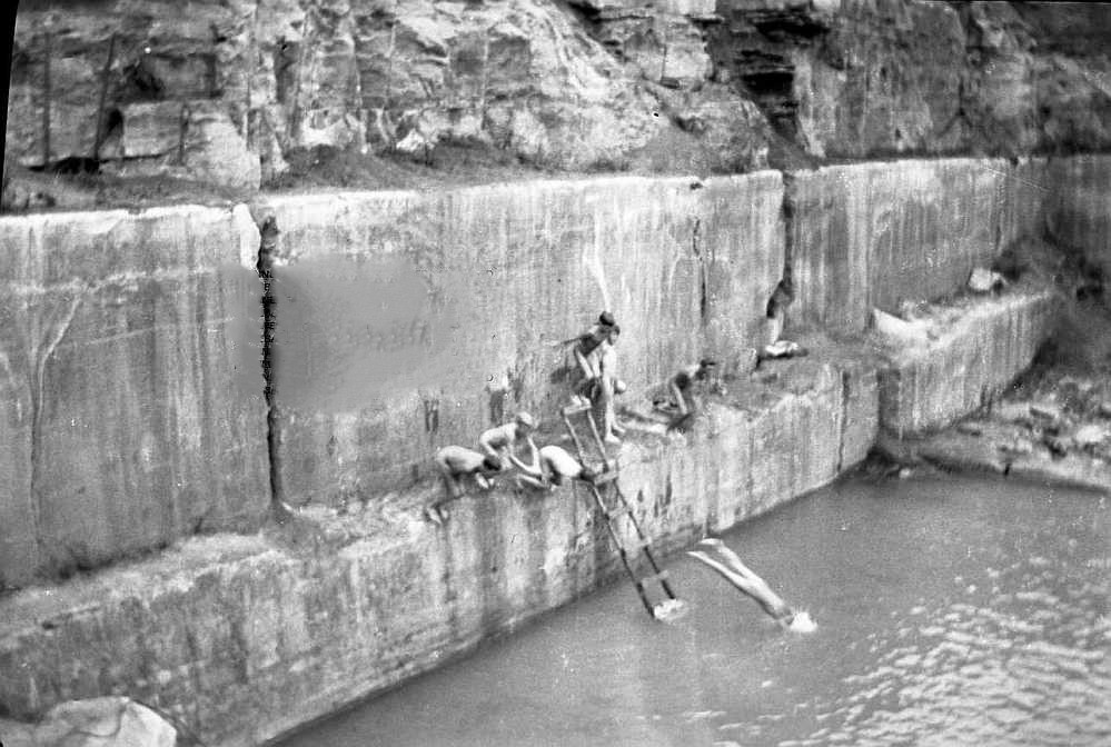 Flooded abandoned quarries were typical sites for boys to skinny-dip. Of course, the hazards posed by these types of locations were many. Hopefully, these boys had swimming lessons before undertaking this risky recreation. This image has no attribution to indicate the location or time of this scene.