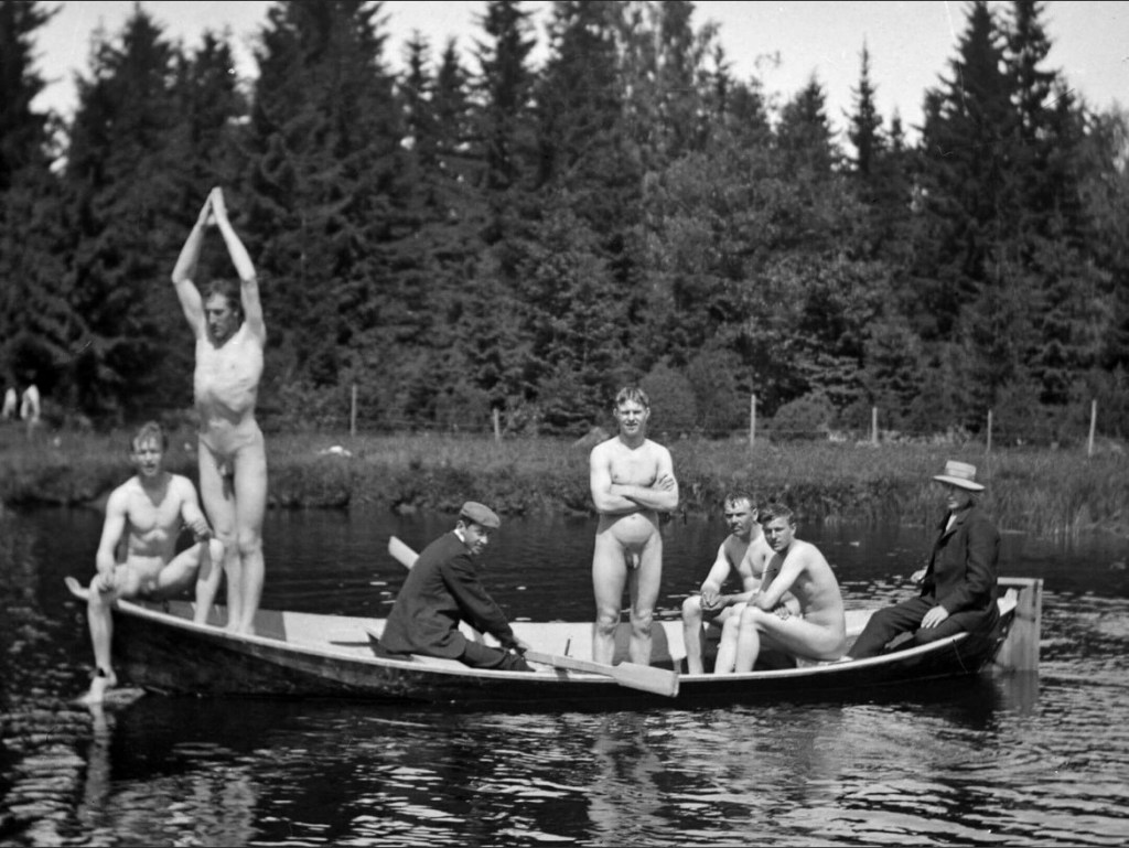 One take away from this obviously old but undated photo is that photographic technology at the time wasn’t up to freezing the action clearly. Nevertheless, the effort bore fruit for us by confirming that these lucky lads were engaged in nude recreation.