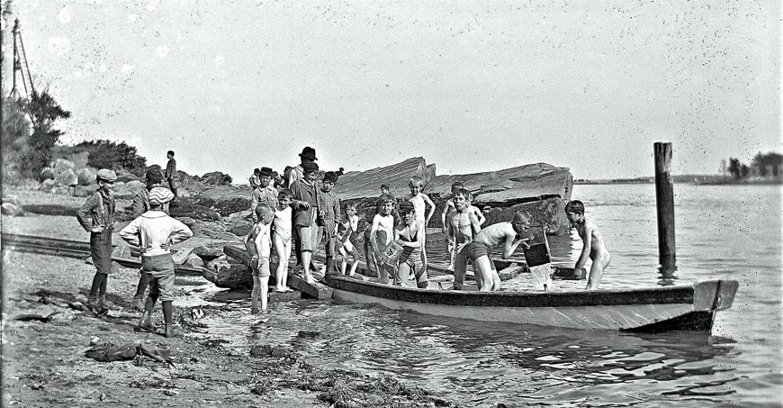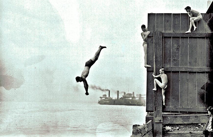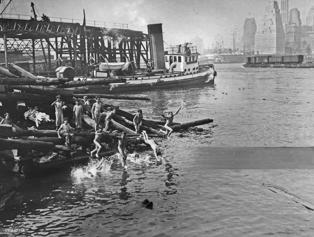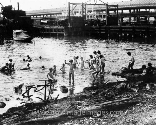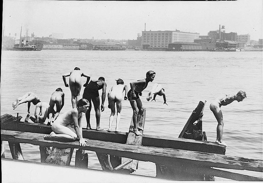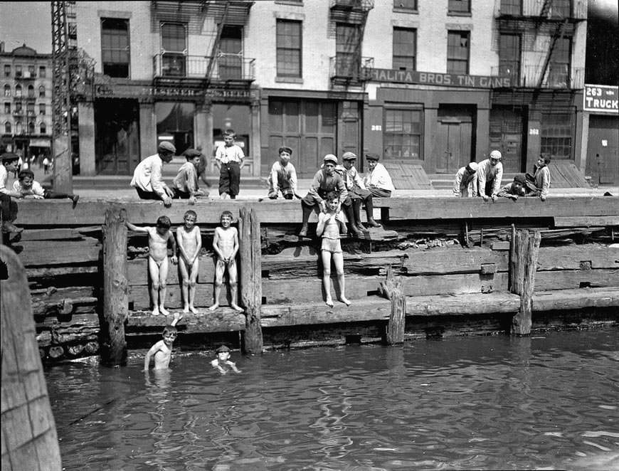This image proports to be from around 1900. At that time, the Lower East Side of Manhattan was a teeming, overcrowded immigrant slum. Most of the immigrants were from eastern Europe and were primarily Jews. Here a few boys are braving the East River while their doubtful companions debate the wisdom of joining them.