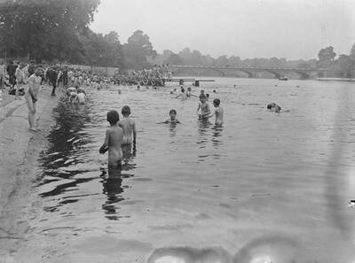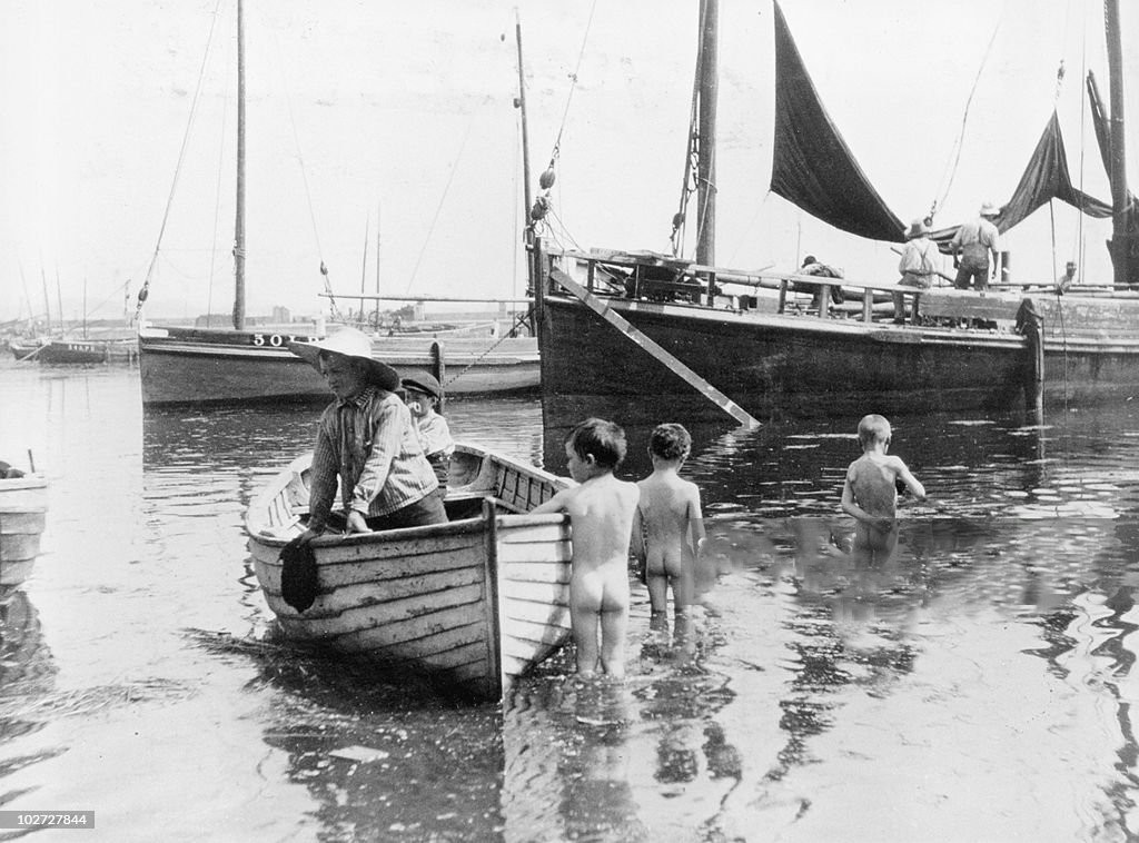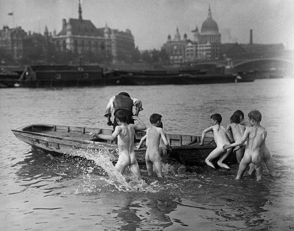 Here is a grittier view of skinny-dipping in the River Thames. The scene is in the waterfront neighborhood of Wapping in the 1930s. The boys swimming among the anchored freight barges may have gotten to a sticky situation. One lad is being assisted from the water by the vigorous exertions of two of his companions while another looks on tensely. A fourth boy is coming on the run, possibly to lend a hand as well. How serious a situation this may have been is not known, but it underscores the hazards of swimming in these industrial settings.
