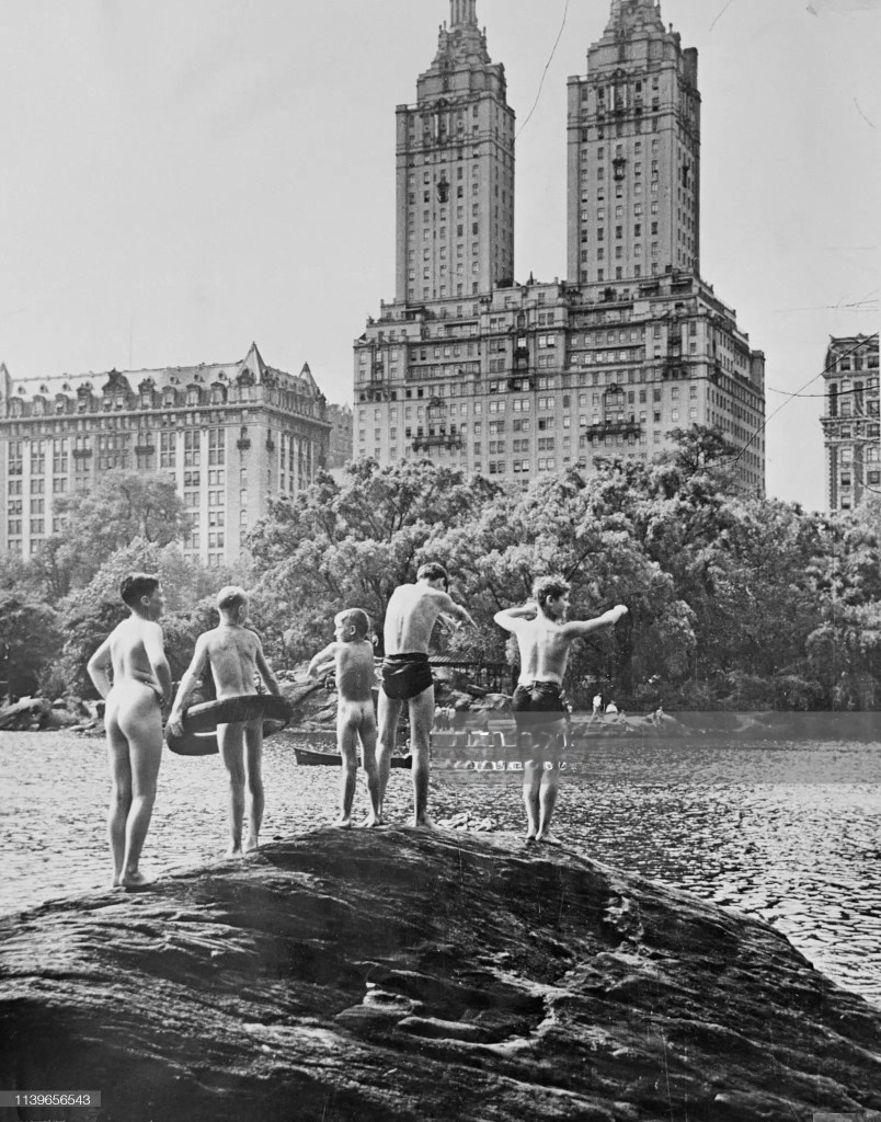 Having viewed multiple images of skinny-dipping scenes in the waterways around the five boroughs of New York City, it’s time to move uptown to Central Park in Manhattan. This scene overlooks The Lake, a 20-acre pond that is one of several bodies of water doting the Park. The year is 1955. It appears that this pond is in use for a range of aquatic recreation including boating. If you consult the Central Park Conservancy website these days, you will see that the public is strictly enjoined from coming into contact with the Park waters. Apparently, there are significant levels of industrial toxins present. It seems 1955 was during a period of blissful ignorance regarding this hazard.