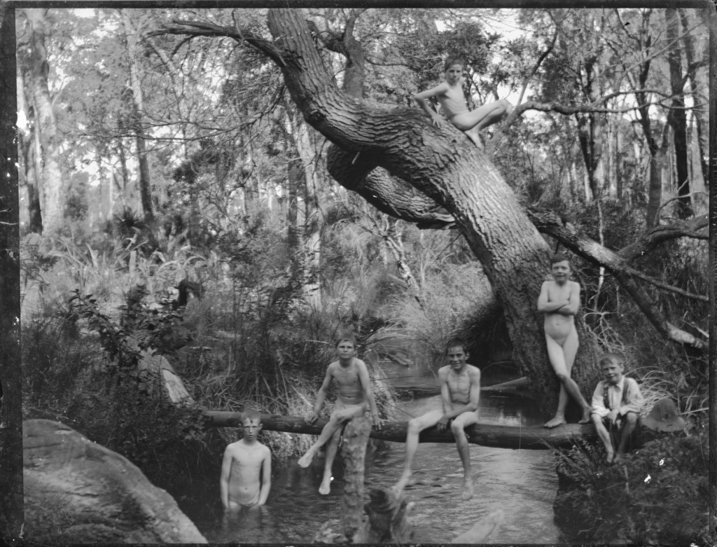 On a lovely day in 1913, five boys were cavorting in the River Torrens which flows through South Australia near Adelaide. At the photographer’s behest, they unabashedly posed in all their glory. Nice look, guys.
