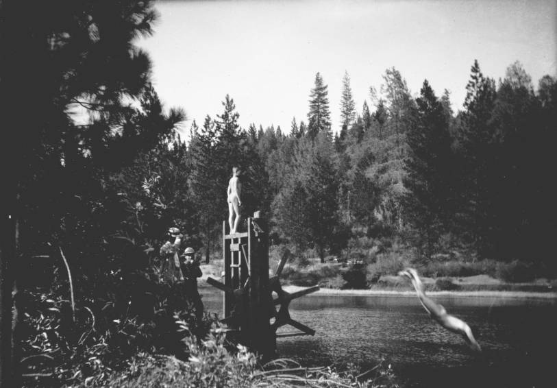 This exquisite image shows two nude males utilizing the sluice gate structure as a diving platform. The scene is from Trinity County in northwest California and the image resides in the California State University at Chico archives.