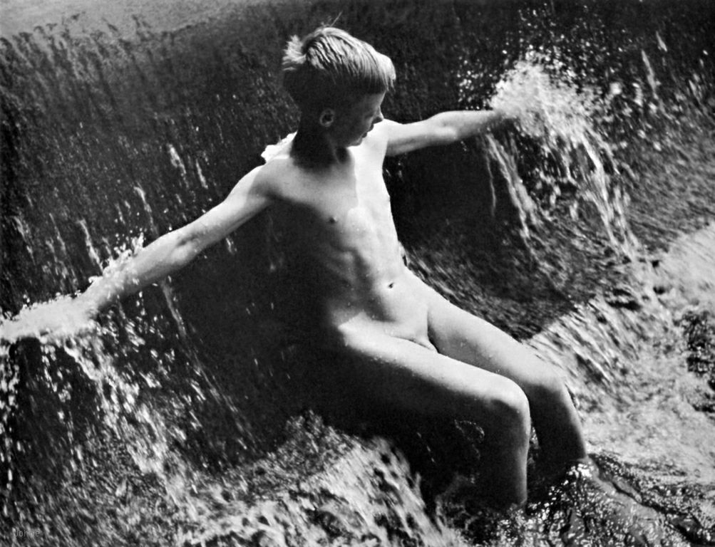 Whereas the boys in the previous image were being pelted by a flow that was kicking up some serious white water, this lad seems to have located a more tranquil setting for his summer afternoon cool-off. His pose is also a bit more forthcoming regarding his male attributes. Unfortunately, this very fine image is unattributed.