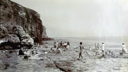 This scene is from the seacoast around Dorset, England. It is the site of an old quarry that was situated on a natural harbor. In the early 20th century, after the quarrying had ceased, some prep schools in the area blasted a hollow into the rocky ledge to form a swimming pool. That was necessary because swimming in the sea there was impossibly dangerous. This undated photo may be from that era, although there appears to be mixed-gender patronage on this day. Nevertheless, the young males seem to be availing themselves of the opportunity for nude recreation, mixed company notwithstanding.
