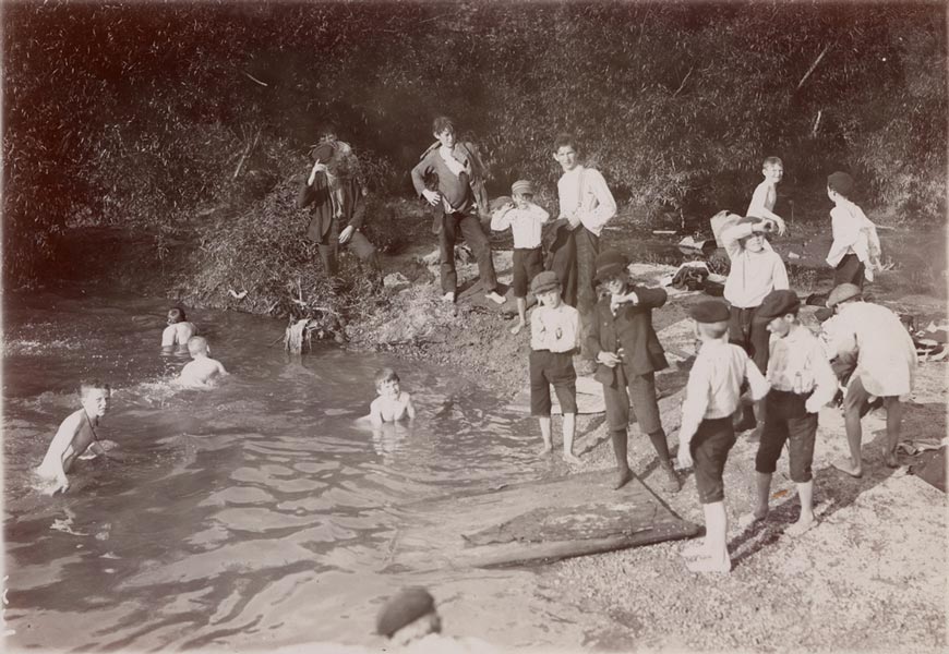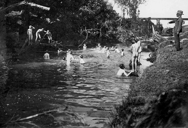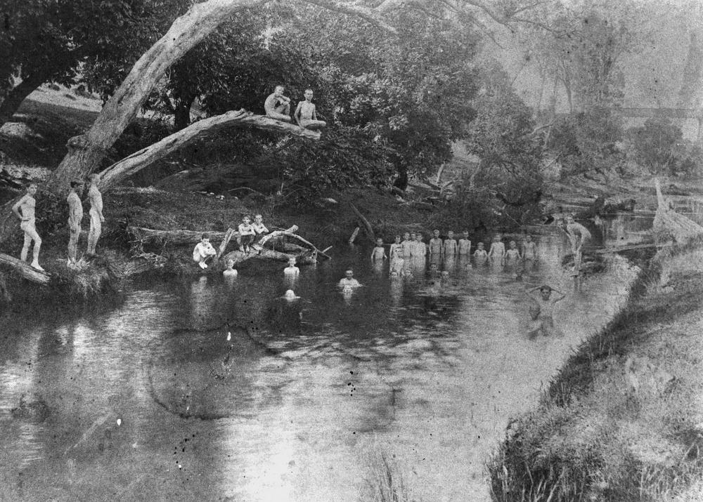 Sometime in the period 1890-1900, a large group of boys gathered for some aquatic recreation in Gatton, Queensland, Australia. Although the meager documentation doesn’t say so, this must have been an organized event. But no one had to organize any bathing suits, thankfully.