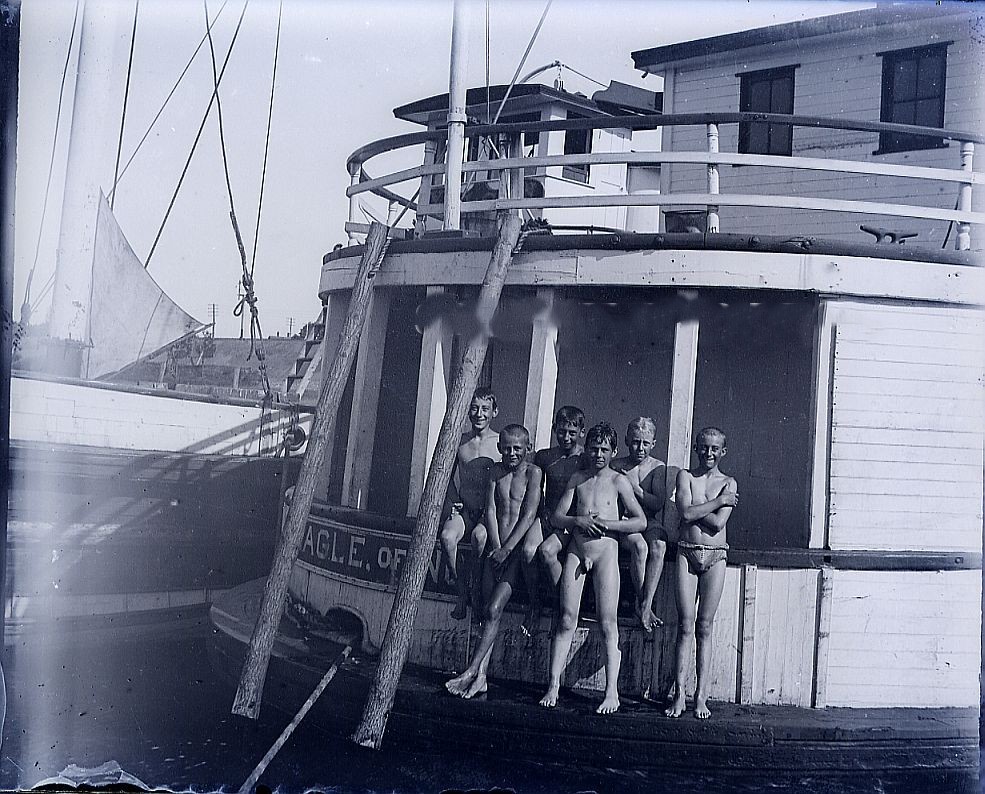 The date of this image is 1897 when this was an active industrial area served by a deepwater port and rail lines. There are hints of that in the background features (the piling on the right, the tower in the upper left and the narrow gage rails in the center left). Whatever the purpose of this gathering, the individual boys have chosen an array of costumes, including nothing at all.