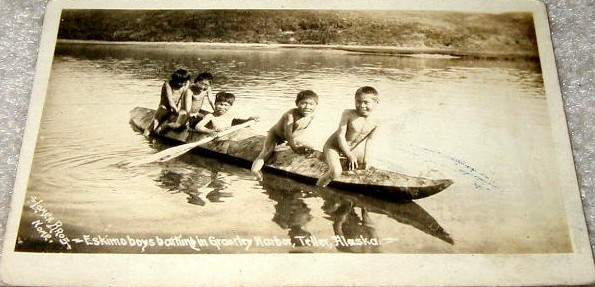 One day sometime during the period of 1908-15 a professional photographer from Nome took these shots of native boys playing in a kayak. Since it happened during the brief summer, the boys were nude of course.