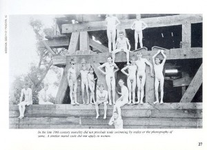 This very low res image was lifted from a 1975 book relating the history of the Delaware and Raritan Canal which crossed northern New Jersey. The figures are boys availing themselves of the cooling effect of the canal waters below the abutment that supported a drawbridge over the canal. The caption reads: “In the late 19th century morality did not preclude nude swimming by males or the photograph of same. A similar moral code did not apply to women.” (Source: Historical Society of Princeton, NJ)