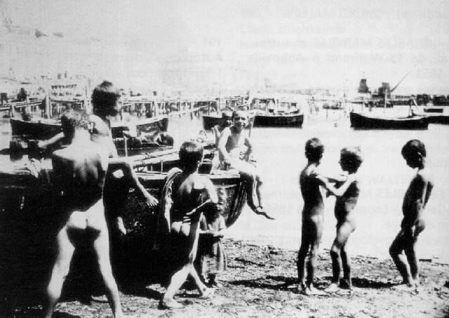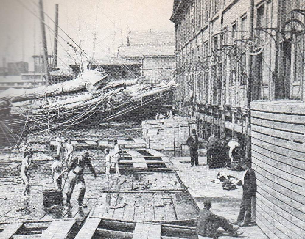 Although the main activity of this facility was fish mongering, the local boys were enterprising enough to see its recreational possibilities. They just piled their clothes on the sidewalk and waded in.