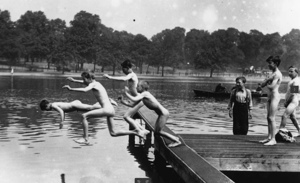 This image records the nude swimming activity in this same Hyde Park location probably around the turn of the 20th century. You will note the throng of nude swimmers. This was because nude swimming was not permitted all day. Apparently, users had to get their skinny dipping in between 4 and 8 AM. Another London park – Victoria – was put to similar use on the same restricted basis. There are photos showing that it was similarly mobbed by the male bathing public. Seemingly, Victorians would tolerate public nudity as long as it was off-hours.