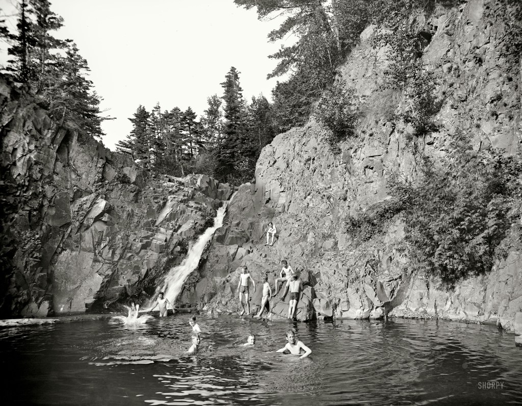 If there is a rival to the scenery in the Hawkings Reservoir photo, it’s this one. The location is near Duluth, Minnesota. The three boys unabashedly offering frontals are probably representative of all of their fellows in the water and above. Based on research, a correspondent advised me that the two “no show” boys are attired in contemporary under drawers. Those are not swim suits. Apparently, they were willing to go only so far for the camera.
