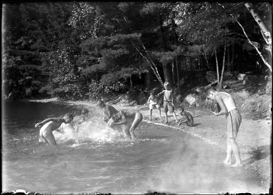 As long as we’re on the topic of images with mysterious provenance, here’s one to ponder. The only attribution is “USA 1930-1940s.” But even more intriguing than its origin is the high drama captured in this scene. Some event caused boys that were engaged in nude aquatics to climb out of the water and join their dressed fellows on the dock to watch something unfolding on the lake. Maybe an accident caused those in charge to clear everyone out of the water. I note one unusually tall person seems to be up front of the group (only his head, bare left upper arm, right shoulder and hand are visible – he might be nude as well). Is he the adult in charge?