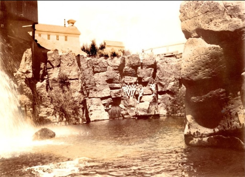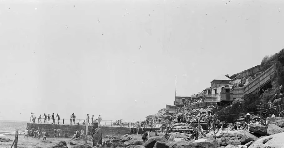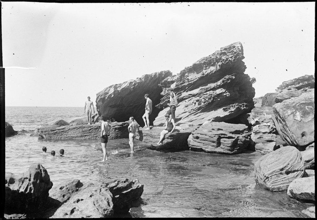 These baths comprise two ocean swimming pools in which the ocean waves are allowed to crash over the seawall and into the lead pool. They are located on the south end of Bondi Beach in New South Wales. The baths were built in 1887 and were replaced by a more modern version in 1931. This image is thought to date from around 1900 when the facility was clothing optional. If you look closely, you will see that many patrons opted out of swim wear. This image is held by the Victoria State Library.