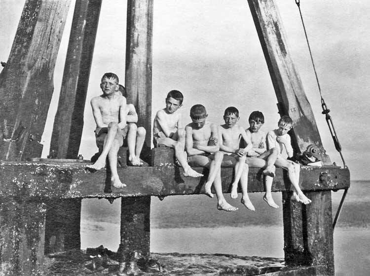 This very interesting image is unattributed. Except for the guy posturing as a diver, everyone is giving their full attention to the camera. This appears to be a staged shot, perhaps an artistic effort, given the high quality of the image.