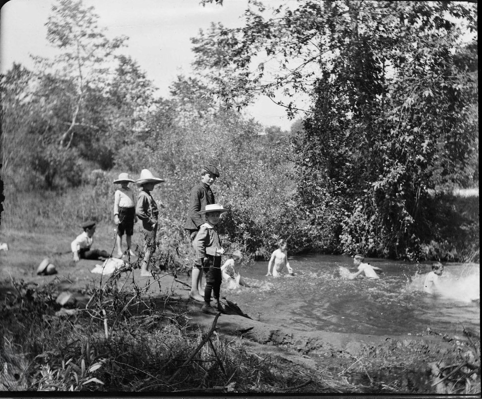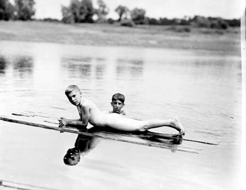This image dates from the early 1900s. The available description says that it depicts the boys of the Danzero family with some of their friends cooling off in a stream somewhere in southwestern Missouri. Thanks to the boy near the center of the photo who stands up nice and tall so we can ascertain that he is wearing nothing. The dressed boy on the stump has an ax handy, so he should not be messed with.