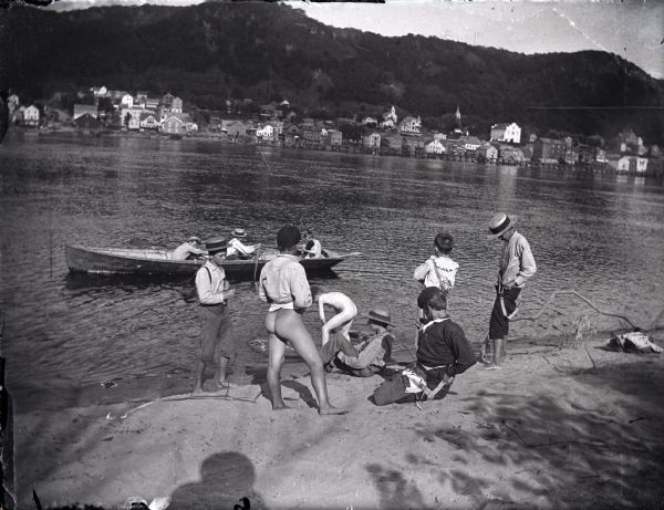 In Alma, Wisconsin (county seat of Buffalo County with a current population of 761), the site of this image, the Mississippi River is not so mighty. Nevertheless, on this fine day around 1900, a few of the local boys decided to take a dip – a skinny dip, of course. This photo catches them in the act of disrobing. Special shout out to the young man of African descent who brings some welcome diversity to this otherwise lily-white scene.