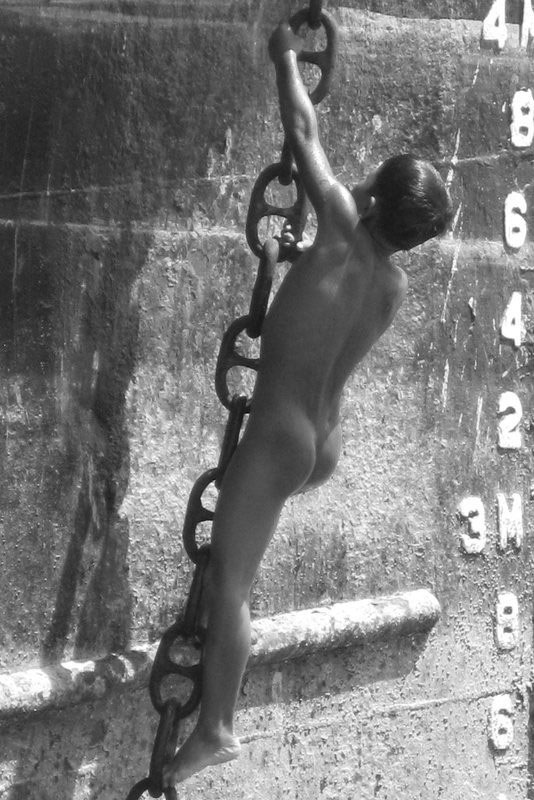This young, nude daredevil undertook his climb at an unknown time and place. That doesn’t detract from how great a pic this is. The submergence graduations on the hull are in meters, which suggests a non-US origin, but, by definition, ocean-going vessels can be anywhere in the world. No help there.