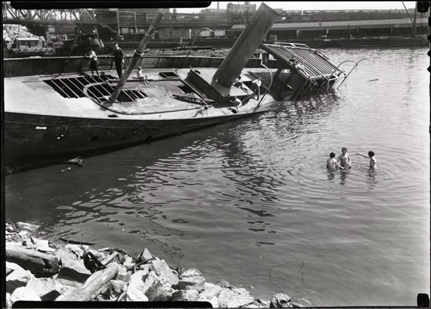 Unlike the previous picture, this one has a date: June 11, 1932. It’s a familiar image of a derelict ship with all of its attendant hazards being used as a skinny-dipping base.