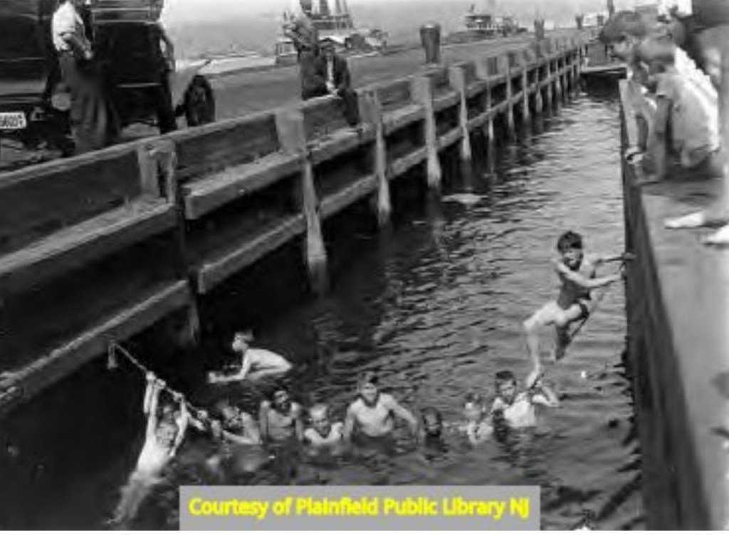 Northern New Jersey was no stranger to urban skinny-dipping, apparently. As the placard across the bottom indicates, this image is from the Plainfield Public Library archives. However, this waterfront scene could not have taken place in Plainfield, which is well inland. Newark or Perth Amboy, New Jersey are more likely locations due to their port facilities.