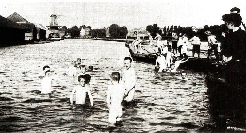 We’ve seen similar scenes in the Danish portion of Nordic Natators – waterways passing through populated areas whose banks are confined by bulkheads and whose water was full of nude boys. This body of water was known as the Schie. It no longer exists as such. It now flows through a manmade underground conduit. A thoroughfare known as the Stadhoudersweg was built over its course. At least the boys made good use of it while it existed. (Gotta love the windmill in the background – very authentic.)