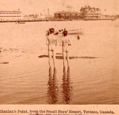 This image is from a very different part of Toronto. The name Hanlan’s Point refers to the western most of the three islands south of the city on Lake Ontario. It is and has been the location of multiple beaches. Some of them are purposed for clothing optional use. This image from 1895 probably shows a scene not of skinny-dipping (an outlaw activity) but rather sanctioned nude recreation.