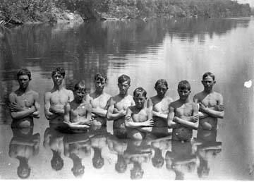 The Oregon State University libraries from which this image was obtained simply states that this is a picture of skinny dippers showing unknown men in an unknown river. The photo apparently resides in a collection that has a date range from 1890 to 1925. The only quibble I have with that information is that, try as I might, I cannot find any “men” among the adolescent boys in this frame.