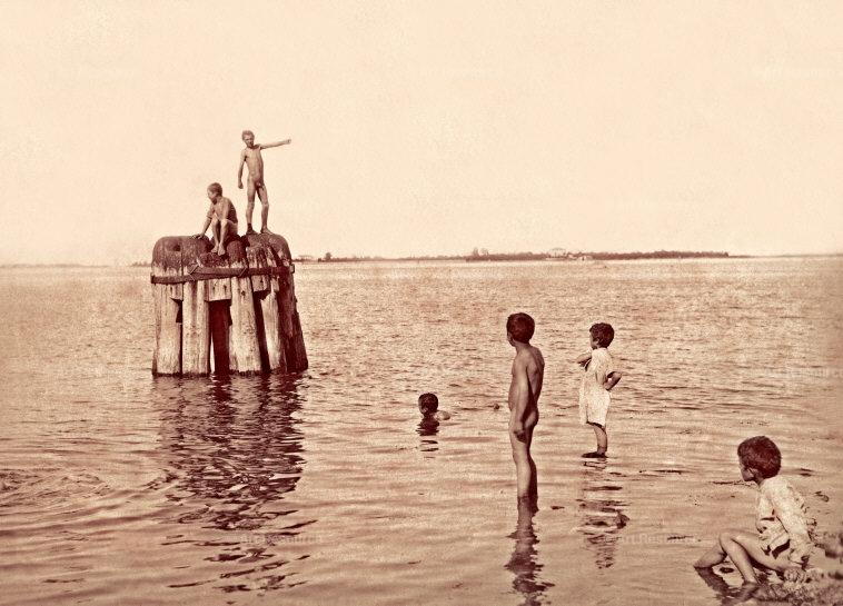 We’re back in Naples a couple of decades later in the waterfront district of Mergellina where some boys are lazing away a summer afternoon after a swim – nude, of course. The crenellated tower in the background might be Castel dell’Ovo, a scenic point in the neighborhood. As you can see, the quality of the photography has improved since the 1870s.