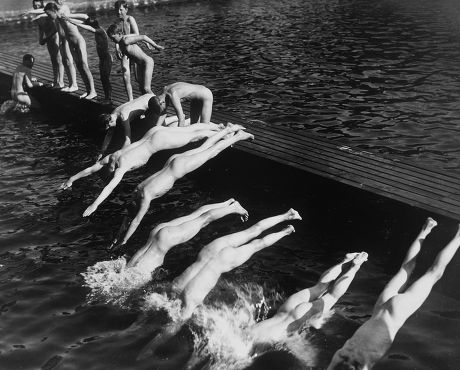 This scene from the late 1920s records the regular use of this lake/pond in this famous London park for nude swimming during this era. The park underwent some renovations a few years after this photo was taken. After that, nude swimming was more restricted.
