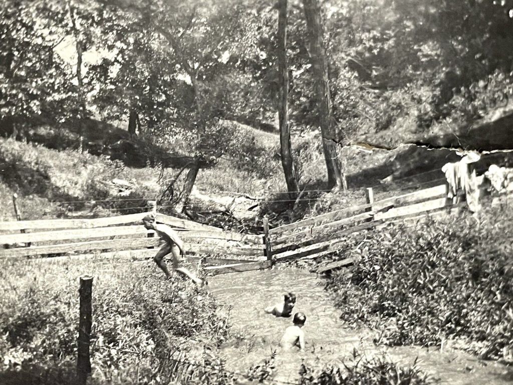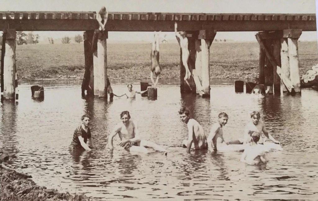 The Toledo Lucas County Library in Ohio reports that this image was made around 1920. The canal had been closed and abandoned in 1913, so there was no interference from barge traffic when these boys decided to utilize it. The advantage of canals for swimming was that the channel was usually a uniform, shallow depth with no currents – the closest thing to a swimming pool rural boys at this time could hope for. The bonus of this location was that the rusty lock works provided a serviceable diving platform.