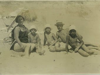 My first thought on seeing this image was pity for the boy who apparently inherited his father’s prominent ears. After that the interest shifts to the fact that all of the adults are in street clothes (rolled up trouser legs and hiked skirts in deference to the surf) while the children are in swim mode. The fact that the girl is wearing proper swimming attire suggests that this was a planned trip. Therefore, the boy’s nudity was also planned, notwithstanding that, he seems to be the only person in the picture foreground or background so arrayed.