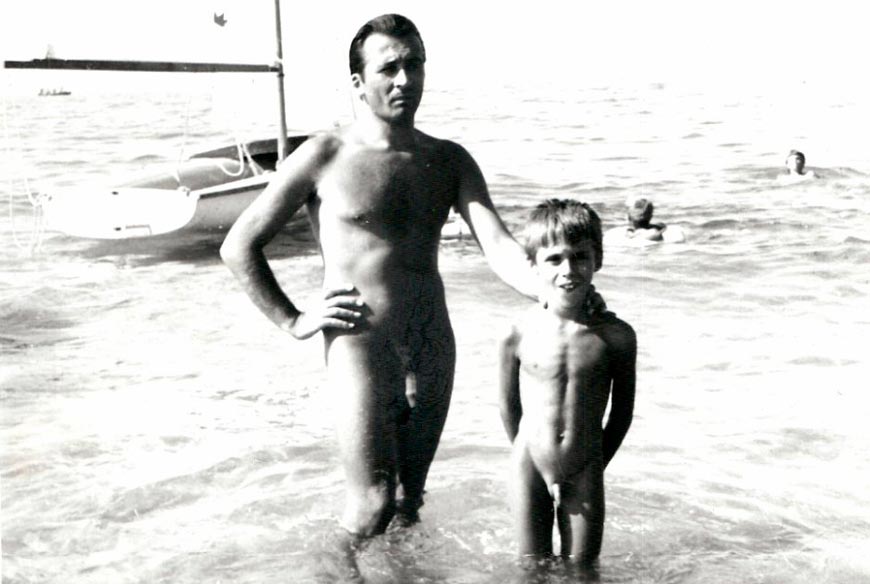 Apparently these three photos capture scenes from a family outing. In the first image, the mom and the kids are apparently taking their ease after the children shed their clothes on the spot. The young men went all the way while the little girl retained her panties and the young woman (maybe a teenaged daughter) wore a swim suit. In the second shot, the sartorial state of the well-groomed older male cannot be ascertained. The question seems resolved in the third image, but it’s a bit nuanced. The third image was Photoshopped in 2023 – apparently by the correspondent that sent it to me. It turns out that this photo appeared on a nudist picture site in its present condition on December 28, 2009. It therefore seems legit and unaltered – Dad (?) is actually nude like his sons (?).