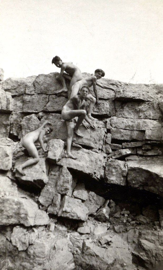 This otherwise unattributed image is alleged to date from the 1920s. Indeed, the taller (older?) guy in the center of the scene appears to be sporting a part-down-the-middle hairstyle that was common in that period. Where this incident took place and what inspired a group of naked boys to scale these rocks will remain a mystery. The photographer apparently didn’t mind penises in the frame since two of the figures are partially exposed.
