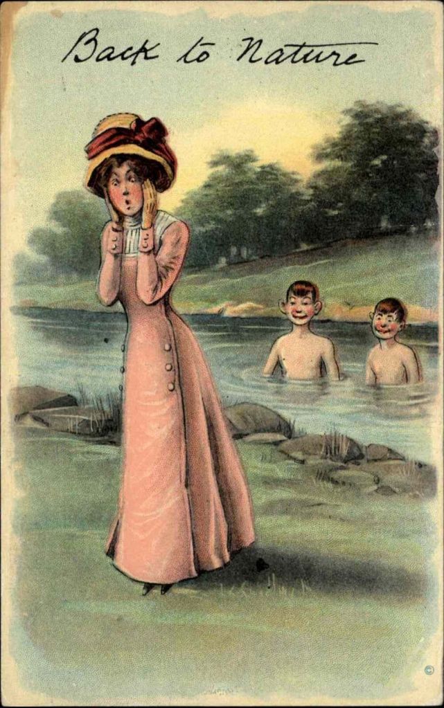 On the humorous side is this fanciful depiction of well-dressed matron (spinster?) reacting to the public nudity of two jug-handle eared scamps who are enjoying her discomfiture.
