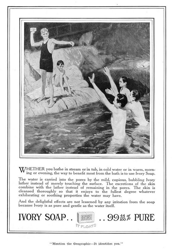 This 1915 ad for bath soap is right down the middle of this topic. The connection between the obviously nude male swimmers and bathing soap is completely appropriate.
